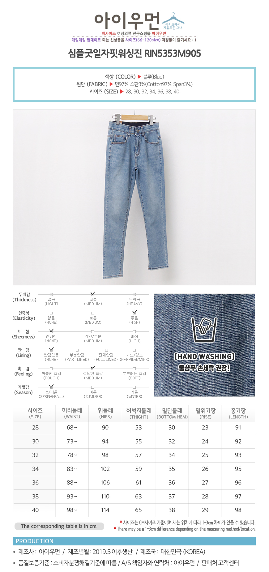 여성의류 | 심플굿일자핏워싱진 RIN5353M905 빅사이즈